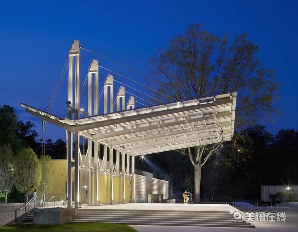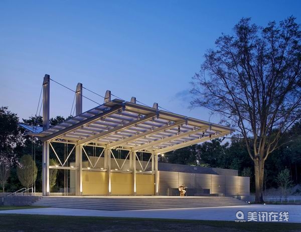 建筑設(shè)計:Pearce Brinkley Cease + Lee PA建筑設(shè)計公司 地點:美國北卡羅來納州費耶特維爾市(Fayetteville) 建筑面積:558平方米 項目團隊:美國建筑師協(xié)會會員Jeffrey S. Lee、美國建筑師聯(lián)合會會員Jennifer Olson 合作設(shè)計:SFL+A建筑師事務(wù)所 客戶:費耶特維爾市政府 結(jié)構(gòu)工程:Fleming & Associates結(jié)構(gòu)工程資訊公司 機管系統(tǒng)、電氣工程:Stanford White & Associates公司 總承包商:Ellis Walker建筑工程公司 工程年份:2004年 盡管費耶特維爾市街區(qū)有限,但戶外活動還是廣為市民所接受,2004年的一項《戶外活動需求評估》顯示出廣大市民對多功能戶外活動空間需求的強烈,而美國費耶特維爾市節(jié)日公園表演館(Performance Pavilion)即是這樣的一種空間。 該表演館是費耶特維爾市新的節(jié)日公園整體規(guī)劃中最主要的一項建筑工程,節(jié)日公園位于靠近市中心的一塊需要凈化空地上,從上世紀30年代一直由一家粉煤脫氣工廠使用,該場地的整修工作已與2004年完工。 除了新建的建筑對該凈化場地的影響之外,其他現(xiàn)有的物理特性也大大影響了設(shè)計過程。該場地被一條主路、一條使用中的鐵軌以及一條雙車道城市大街圍成了一個三角形。場地上還有許多被保護的樹種。場地還被一條河流一分為二了,會造成季節(jié)性洪水災(zāi)害。 表演館由兩部分組成:一個又頂高架舞臺與一個封閉的矩形后臺,設(shè)有更衣室、衛(wèi)生間、電器音響間與倉庫。出于日常使用的考慮,該表演館設(shè)計的更像是一個空曠的廣場。為此,后臺建筑像一側(cè)稍稍傾斜了一點,可使視野開闊,一直看到樹林,架空通道所用的不透明面板可收縮到后面的平穩(wěn)木板墻上,充當(dāng)幕布。 該像工程的目的是確保觀眾的視線不受任何阻擋以及營造一種激動的氛圍,而使用結(jié)構(gòu)鋼便是達到這兩個目的的至關(guān)重要的一點。為了最終達到這兩個目的而做出的方案是使其相互依存,舞臺前方是完全開放性的設(shè)計,這是通過一個懸空的蝶形舞臺蓋頂與一個鋼墊系統(tǒng)以及高強度鋼管實現(xiàn)的,這個蓋頂是用寬幅凸緣型鋼板與鋼管檁條交織而成的,頂部使用擠壓聚碳酸酯材料包覆,雨水可通過頂部的焊接鋼管排水溝排放到位于舞臺右側(cè)的假山水池里。 工程中還特別關(guān)注到了細節(jié)與制作工藝:如照明裝置與音響設(shè)備實行同步隱形布線,作為連接部件的面板全部采用噴水切割技術(shù)等。