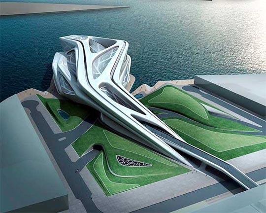 哈迪德的設計理念反應了建筑學中的解構主義理念。這是模擬出的表演藝術中心鳥瞰圖。