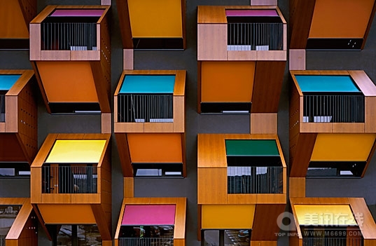 這個嶄新的漂亮的海濱建筑物脫離了普通的政府為低收入者修筑的住宅設計模式,使用動態數組的排列方法排列配有明亮遮陽板的單人房。設計理念來源于蜂巢的成串的模式,這個住宅聯合體是為斯洛文尼亞海岸Izola工業區低收入的家庭和夫妻修建的。這個惹眼的建筑聲稱有美麗的視野并能巧妙的運用遮陽板和自然通風來控制整年的內部環境。 在第一眼看到這個住宅時,人們都會情不自禁的被住宅美麗的錯列排列的陽臺所吸引。設計模仿蜂巢結構的韻律,布局設計創造出了動態的升高,保護了周圍的居住著的隱私。這個項目是由核心為9人的設計團隊合作修建的,他們分別是:Rok Oman,Špela Videčnik,Martina Lipicer, Neža Oman, Nejc Batistič,Florian Frey,Marisa Baptista,and špela uršič。 每一個陽臺頂部都覆蓋有彩色的織布遮陽板,這能提供有效的遮陰和通風。固定在陽臺前端的紡織元素能阻斷直接日照并聚集空氣緩沖帶。夏日,熱空氣聚集在遮陽板后的區域,通過陽臺上分隔出來的有著10厘米鑿孔的墻面自然通風。冬日,熱空氣保留在這個區域,給房間提供輔助加熱。