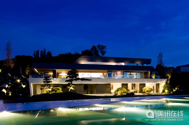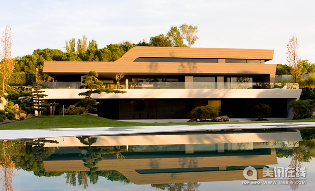 ![]() ![]() 西班牙建筑公司A-cero在Joaquin Torres的指導下,在馬德里郊區建造了一座全新的住宅,這座住宅融合了A-cero公司的圖形設計風格和幾年前的技術實驗。這座住宅可歸納至A-cero公司國際擴展項目之中,之前的建筑項目有在多米亞共和國和迪拜之中的。它是一個復雜的立體建筑,各種形狀的運用突出了A-cero的建筑風格和當代雕塑之間的關系。 第一眼看到這座住宅,你就能發現它風格化的曲線和顯眼的外型和諧地融入當地的自然環境之中,同時也清晰地顯露出它的現代氣息。水平的形狀一個堆在一個上,使得整個建筑看上去像是分了層。建筑正立面使用紋理結構的黑色混凝土。 自然的實體和人工的外形,讓人不由聯想起極簡抽象藝術雕塑家David Nash的作品。 內部格局非常豐富,房間的高度和水平位置各不相同,其中一些房間的形狀還很特別。大廳在住宅下層,大廳的頂上是曲線的天花板。起居室、餐室、主臥室、健身房、室內泳池、廚房和服務區也都在下層。住宅上層有一個畫室,天花板也是曲線的,這里光照充足,并且能一覽周圍景色。地下室則是保健和休閑的場所,這里有酒吧、游戲室、休息間、按摩房、放映室、酒窖和健身房。 住宅里并沒有使用柱子,以及一些能影響空間流暢性和開闊性的元素,室內設計使用輕質材料也就是為了這個目的。地板使用的是大格子白色瓷磚,浴室則使用白色鋁制材料。