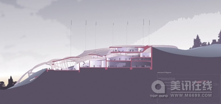 ![]() ![]() ![]() Asemic Scapes是在奧地利阿爾卑斯山脈的一家醫療康復中心,為精神受到創傷和外科手術后的病人們提供服務。它由設計師Sarah Schneider設計,這名設計師剛剛畢業于維也納應用藝術大學,而這個項目正是她的畢業設計。 Asemic Scapes計劃可以同時容納50名病人,陽臺上的風景非常不錯,病人可以鳥瞰群山還有在叢林中若隱若現的步道。 該康復中心繼承了十九、二十世紀前輩的衣缽,不僅依靠科學技術的力量,而且充分利用大自然的力量,這也是選址在此的原因。 Sarah Schneider根據當地的自然景觀特點設計該建筑的外觀與結構,她通過設計臺地園規劃好各個區域,通過設計小徑模糊室內外的界限,這樣,Asemic Scapes醫療康復中心看起來就像渾然天成一樣。