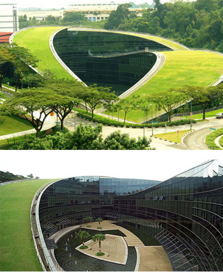 看看座位于哥本哈根的郊區的高中校園吧,很難想象有人會不想去這里上學。這是一個完全開放式的高中,教學樓采用現代化的設計,明艷色調的彩色玻璃,可以隨著太陽自動旋轉的彩色窗戶……整棟樓看上去就像一個玩具大盒子。而內部更是愜意:夢幻般的旋轉樓梯、學生休息室的平臺上提供大大的橙色枕頭,學生可以坐著躺著趴著,絕對釋放壓力。 2、新加坡 綠色屋頂的藝術教學樓