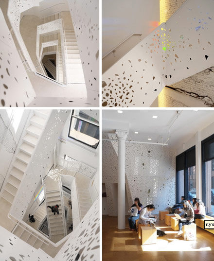 只看紐約大學哲學系的這棟教學樓不起眼的外觀,你永遠不會猜到內部有多么的優雅。建筑設計師史蒂芬-霍爾(Steven Holl)負責這棟大樓的內部裝修設計。優雅而簡約的白色墻壁象征著看上去簡單卻又摸不透的哲學,樓梯回欄幾何造型神秘而別致,還有鏤空雕花的裝飾,增添優雅感。更妙的是,隨著時間和季節的不同,穿過鏤空花飾的光線會在墻壁和樓梯上留下不同的花樣效果。