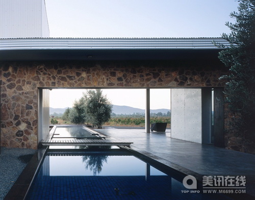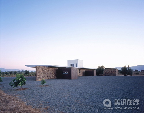 建筑設(shè)計(jì):Sebastian Mariscal Studio 周圍環(huán)境 這個(gè)周末家庭住宅位于墨西哥下加利福尼亞的瓜達(dá)盧普山谷。這個(gè)山谷因生產(chǎn)葡萄酒而聞名,它的周圍是琥珀色的山脈。葡萄園和橄欖樹之間是綿延不斷的公路。房子被建于這些美麗的自然環(huán)境中,這些都同密集的城市生活形成了對(duì)比。 地點(diǎn) 這片莊園由七塊土地組成,這七塊土地都圍繞著葡萄園。每塊土地的入口道路都可進(jìn)入到橄欖樹林中,在樹林中便可看到住宅和葡萄園。根據(jù)延伸的橄欖樹林,我們建造了一個(gè)長(zhǎng)54米,高3米的石制幕墻。幕墻是房屋的主要軸線,它與葡萄園相平行,并垂直于成排的橄欖樹林。 空間安排 房屋是一種直線型的結(jié)構(gòu)安排:公用空間(周圍環(huán)境),半公用環(huán)境(礫石天井),私人空間(客廳)和私密空間(臥室),這種空間結(jié)構(gòu)安排創(chuàng)造了一種視覺上的連續(xù)性。自然環(huán)境定義了房屋的邊界,并且在白天和夜晚,以及在嚴(yán)寒和酷暑的氣候下,為住戶提供了一種變化的感官體驗(yàn)。 住宅的各個(gè)空間通過石制幕墻以及屋頂聯(lián)系起來。在設(shè)計(jì)師第一次踏足這塊土地時(shí),房屋屋頂?shù)脑O(shè)計(jì)構(gòu)想就應(yīng)運(yùn)而生,設(shè)計(jì)師希望給這里帶來一大片陰涼地帶。 屋子的入口處位于游泳池和橄欖樹林之間,露臺(tái)通過玻璃門自然的將客廳/用餐室/廚房結(jié)合了起來,游泳池為生活注入了活力,同時(shí)它也是一道美麗的風(fēng)景,恬靜且清新。 門檻橫跨在一個(gè)木制的橋之上,這座橋延伸到一個(gè)窄窄的走廊之上,通向花園和臥室,這種設(shè)計(jì)構(gòu)思來源于一個(gè)古老的傳說。房屋的下面鋪就的是礫石,這層礫石是房屋的基底,同時(shí)它也防止了灰塵侵入屋內(nèi)。