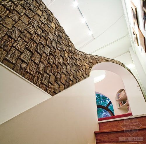 ![]() 迫慶一郎先生將一棵大樹解體成各個要素:樹干、樹枝、樹皮和樹葉,并將這些要素嵌置于空間之中。將其對其進行分割?加工從而抽象化的同時,并不失去其本身的物質感。于是這些素材變成天花,墻壁,樓梯和家具等空間要素被重新構建起來。有點像一條魚切分成各部分,烹飪后又重新組合起來的過程。