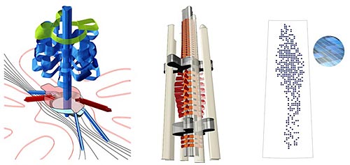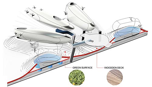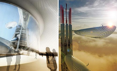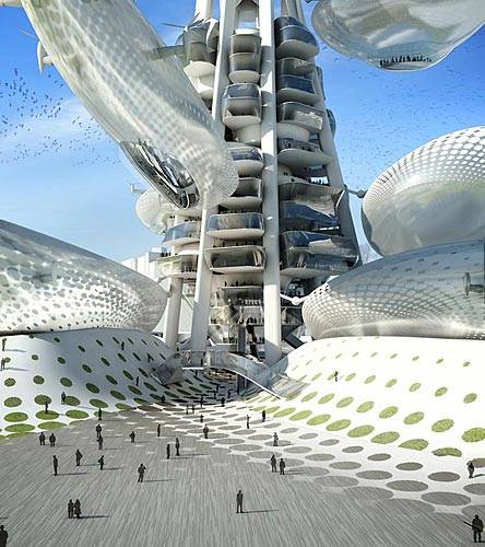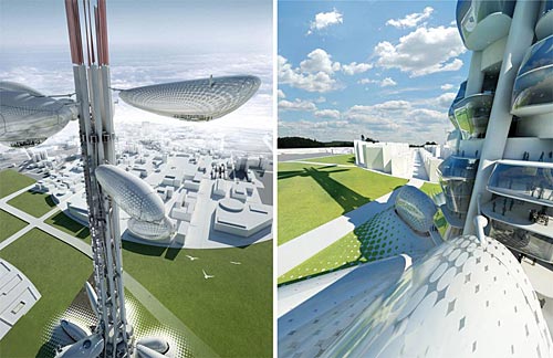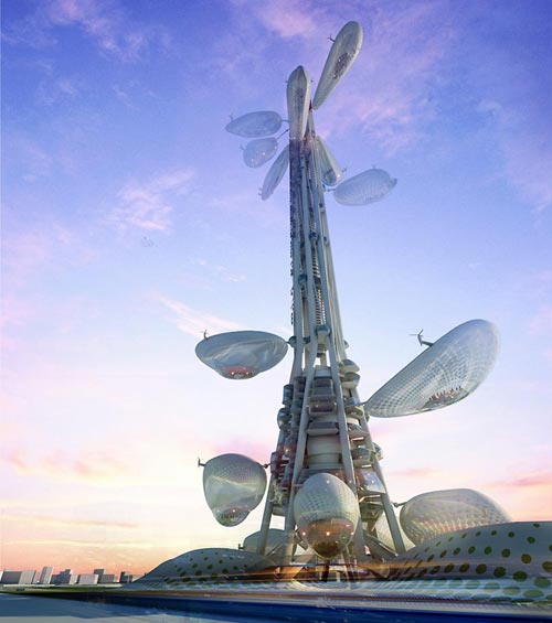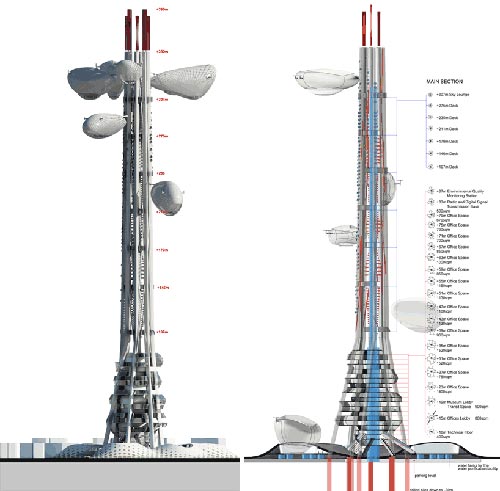 這是臺灣塔概念設計競賽的一等獎,出自由羅馬尼亞的upgrade.工作室和DSBA以及美國的Mihai Carciun三方組成的聯合團隊。 “漂浮瞭望臺”方案概念由upgrade.工作室提出。以植物生長的方式,將多個“豆莢”圍繞塔身主體上下浮動,達到流動觀測的目的。這座未來主義風格的巨塔將包含博物館、信息中心、辦公室、會議中心和餐廳等功能,每個懸掛的“豆莢”可容納50-80人,由控制塔中的強電磁場軌道上下滑動。