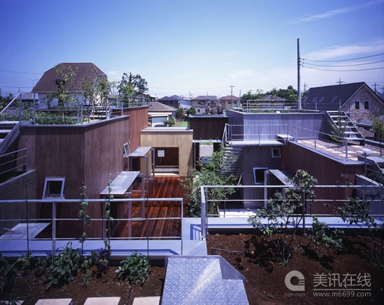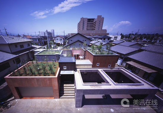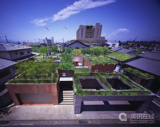 日本RAA公司設計的秘密花園住宅位于日本群馬縣的一個住宅區域中。住宅為一個四口人家庭所設計,由幾個盒子式的空間結構構成,每個空間的顏色,大小和空間設置都不盡相同,符合了每個使用者的需求。一個屋頂花園將這幾個空間聯系在一起,屋頂花園中的所有植物幾乎都可以起到隔離的作用。