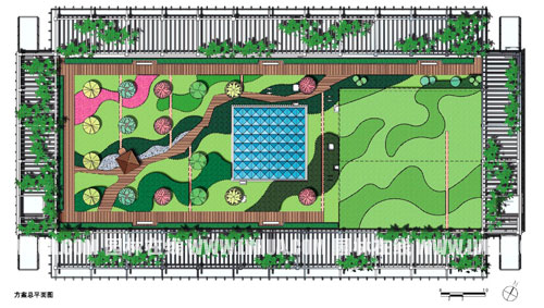 原有建筑及廣場和諧、對稱的設計布局.本次屋頂綠化設計以西方現代園林手法來著重表現,強調結構及斑塊效果。