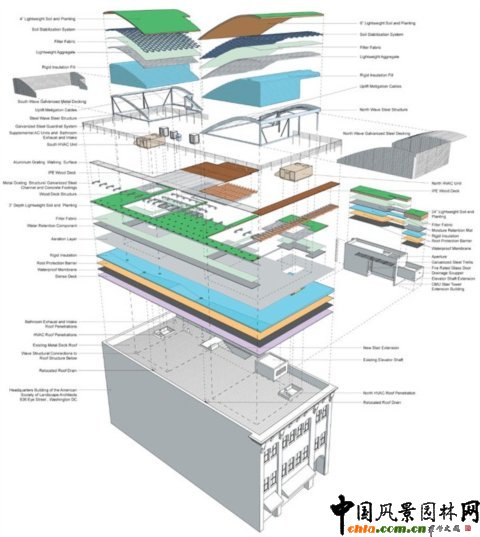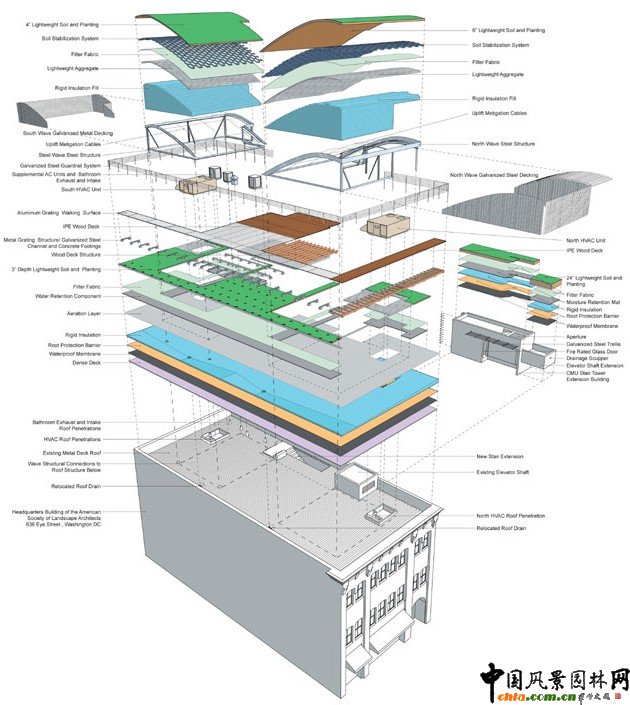 該項(xiàng)目位于美國景觀設(shè)計(jì)師協(xié)會(huì)在華盛頓的辦公樓樓頂,面積3000平方英尺。項(xiàng)目旨在將原屋頂改造成具有教育價(jià)值的綠色屋頂?shù)浞丁?/P>