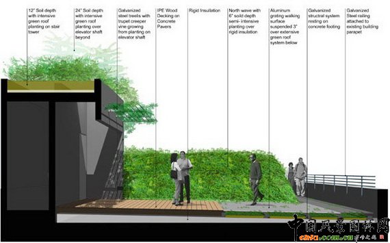 南北的兩個(gè)大土堆抬高了游客的視線,使城市前景更為突出,也使人們關(guān)注到周圍的天際線。土堆由輕質(zhì)材料支撐,但兩個(gè)土堆的結(jié)構(gòu)也有所不同:一個(gè)適合低矮植物生長,他們要求的土壤深度比較淺;一個(gè)需要有深厚的土壤做基底,當(dāng)然,其上的植物長的也會(huì)比較高。這些高一點(diǎn)的植物像一道矮墻,正好可以被旁邊道路上行人看到,“矮墻”告訴行人:這是綠色屋頂。