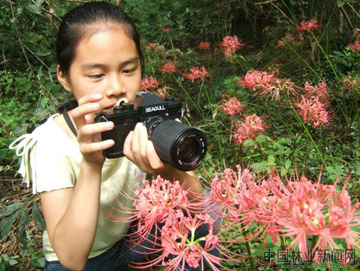 江西省永豐縣的一位小攝影愛好者正在觀賞拍攝石蒜花。紅花石蒜秋季紅花怒放,十分艷麗,布置于地、林下或配植于多年生混合花境中,均可構成初秋佳景。既是冬季理想的綠色地被植物,也是極好的盆花和切花材料。紅花石蒜分布在長江中下游及西南部分地區,我國在宋代就有其記載,還被稱作“無義草”、“龍爪花”,雖觀賞性較強,但根莖有毒,不可隨意食用。
