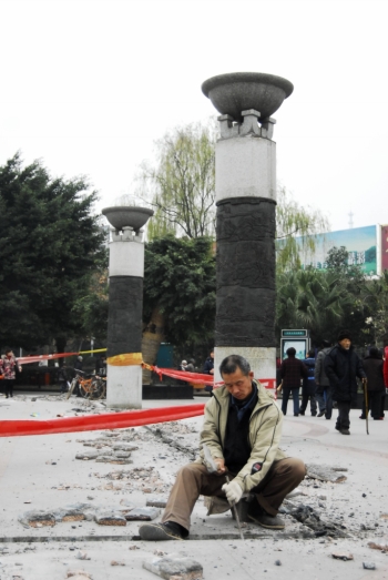 1月16日下午,記者在四川南允市北湖公園看見,數名工人正忙著給公園廣場上的8根景觀柱加裝電線,讓代表“南充八景”的燈柱重新亮起來。