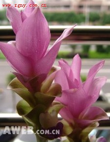 姜荷花屬多年生球根草本花卉,原產于泰國清邁等地,生性強健,性喜高溫高濕,葉子呈長橢圓形,頂端漸尖,中脈為紫紅色;3-5片葉便可開花,穗狀花序,上部苞葉為桃紅色闊卵形不育苞片,下部為蜂窩狀綠色苞片,內含紫白色小花,花姿溫婉如蓮。