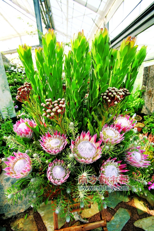 花形如皇冠般的南非國花帝王花,被譽為全世界最富貴華麗的鮮切花。現在,無論是“帝王”、“皇后”,還是“金粉”,3000株各色名貴的帝王花品種都可以在華南植物園展覽溫室觀賞到。 據華南植物園廖景平博士介紹,本次花展將持續整個亞運會和亞殘會期間,帝王花因色彩艷麗,造型優雅,故脫穎于世界名貴花卉,號稱“花中之王”。其花期長達2個月,壽命達百年以上,有旺盛而頑強的生命力。帝王花價值不菲,每朵約200元,本次展出,植物園花費約60萬元專程從南非空運而來。 昨日,南都記者在華南植物園展覽溫室第一時間觀賞了這批“花王”,“皇后”、“帝王”、“金粉”、“圓玫瑰”等都正值花期,在非洲土著圖騰和雕刻營造的氛圍中,沿著石縫、假山、盆景開放。據悉,花展期間,木百合、針墊花、黑山草等其它非洲植物將與帝王花同時展出。同時,“亞洲植物大觀”、“亞洲植物文化展”等將同期推出。在亞運會開幕當天及后兩天,亞殘運會開幕及后一天,市民來華南植物園賞帝王花將享受門票六折優惠。