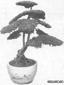 作者在10年前便根據樹坯的條件作了全面構想,努力追求看似抽象實則深遠的詩情畫意,大刀闊斧地刪去繁枝冗節,突出三根主干,經過反復的補蟠修剪,逐步達到干身粗壯。枝蒼翠的效果,與國畫中的柏造型相近似,待到繁花怒放,于是就出了“六月飛雪”的奇觀。