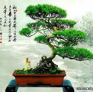 顧影生情:給人的印象,或是一眼清泉、一灣湖水,或是一條清流漪漪的小河,大樹穩扎堤岸,樹梢橫臥水面,以水為鏡顧影自憐。造型以模仿江堤岸邊的斜臥大樹為主,樹根總向一邊生長,與樹根連成一氣,浮露出泥面的根“拖沙糨”給樹身配重,樹冠最好有一大飄枝,且枝法要精練,臨水飄佛,與主干相映成趣。枝托 的配搭要有搖曳生風之感。枝型多采用鹿角枝、雞爪枝、飄枝和自然枝等。
