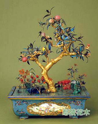 鑲寶石九重春色圖盆景,清乾隆,造辦處造,通高50.5cm,盆高12.6cm,盆徑40.3-25.7cm,足徑24-11cm。清宮舊藏。掐絲琺瑯長方形盆,盆壁以湖藍色釉鋪地,四面中央為銅鍍金鏨花沿開光,內(nèi)嵌彩繪西洋人物景致的畫琺瑯片,開光外上下和四角掐絲花卉紋。盆中以玻璃鋪地,上植花草樹石。主景為桃樹,銅鍍金枝干,點翠,金蕊染牙花,桃實則以碧璽、芙蓉石、玉、黃料等多種玉石制成。樹下周圍襯有孔雀石、芙蓉石、染石山子以及用芙蓉石、瑪瑙、香瓣制作的小石榴樹和什錦花。此件盆景工藝精湛,意態(tài)生動,設(shè)景主次分明,錯落有致。鍍金桃樹干顯現(xiàn)出一派富貴氣象,點翠桃葉上的金色葉脈和寶藍色光澤的翠羽至今鮮明亮麗,各類寶石制做的桃實玲瓏可愛。杜甫《奉和賈至舍人早朝大明宮》中有詩句:“午夜漏聲催曉箭,九重春色醉仙桃。”此桃樹盆景即寓詩中“九重春色”之意,表現(xiàn)春光明媚、欣欣向榮的太平景象,桃與壽石配景又含祝壽之意,這是清代南方盆景廣泛采用的一種式樣。此盆景為清乾隆年間不可多得的佳作。