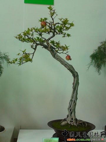 作品簡介:該作品為用石榴制作的“文人樹”樁景。靈秀的樹干配以綠紅果,引人入勝。曾在省第七屆盆景展中獲銀獎。