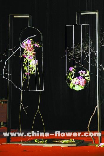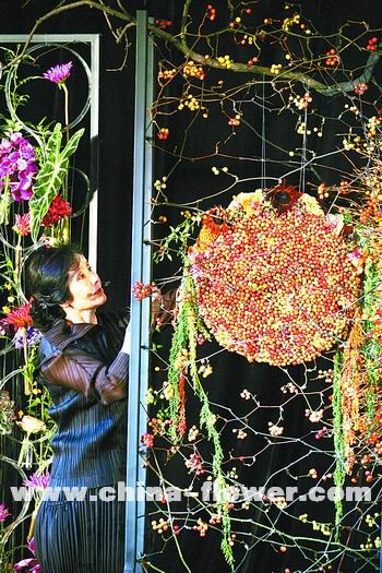 柔婉女子 大氣依舊 第一次接觸韓國知名花藝師金英珠,是在去年第七屆花之韻上海國際插花藝術展上,一場大氣淋漓的花藝表演,讓在座的觀眾不敢相信出自一位柔弱的東方女性之手。在本次花藝表演會上,金英珠延續了其一貫的大氣風格,依然注重所有舞臺作品的組合連貫效果。作品完成后,既相互獨立,又有所聯系,成為一件組合“大作”。 金英珠的這場表演以中國傳統“方”、“圓”理念為詮釋核心,將其善用的大型金屬架構再次搬上舞臺。主作品由三件作品組合而成,舞臺正中的作品用枯樹枝打底,樹枝被綁扎成放射狀懸掛于鐵架之上,上面附有各色花朵,顯得秋色斑斕。圓形內里用五色雞冠花裝飾,形成半月形;向上延展的荷葉與向下垂吊的稻穗相互呼應。圓形作品兩側是兩個長方形鐵架架構,其中包含著多個大大小小的圓形,十幾支各色繡球隨意懸垂其上,繡球修長挺擴的感覺,輔助以一些藤類纏繞,呈現出一種深秋從容之美(如圖2)。 金英珠的作品以境界見長,其創意雖未見大的突破,但此次表演的作品,更加工于格調。其后一件作品中,對稱的兩個鐵藝架構,互為反正、相對而立,呈現出繁體漢字“門”的造型。其中寥寥兩根樹枝,便營造出庭院深沉之境界(如圖3)。整場作品中唯一一件用粘貼手法創作的架構,滿滿的紅豆黏在一個圓盤上,兩邊掛以沉甸甸的麥穗,懸掛在U型鐵架上,周圍遍布紅豆枝,秋色原野爛漫之美即刻呈現眼前,令人叫絕(如圖1)。