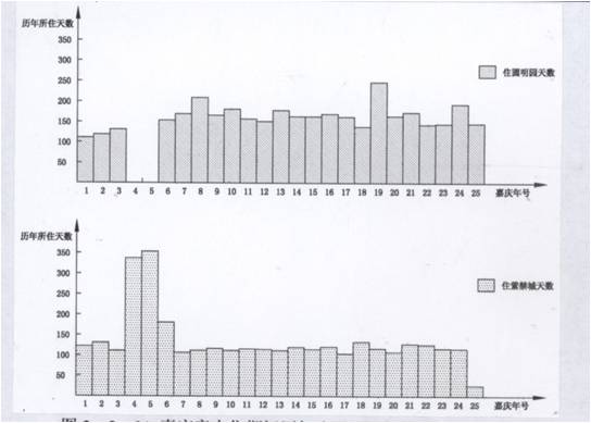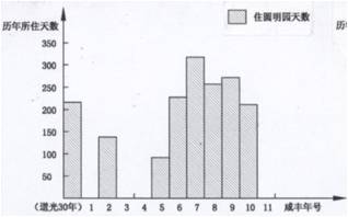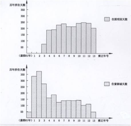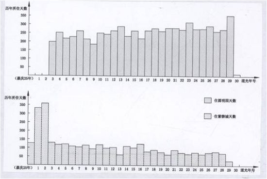 一、圓明園景觀的個性 圓明園具有本身的特性:內容豐富,類型多樣,其中有政務性建筑——舉行朝儀典禮殿堂、日常辦公的場所,寢居建筑——帝后的寢宮、皇子的居所,文化建筑——書院、書樓、戲臺,宗教建筑——佛寺、宮觀,觀農驗農建筑——田圃、村舍,園林建筑——觀賞自然的山水園、寫仿的天下名園、引進的歐洲庭園,其涉及面之廣可謂諸多皇家園林之首。但是到了今天,圓明園還有許多其他的特色沒有得到展示,大家沒有得到她的具體情況。 1、如何認識圓明園的景觀 就其個性來看,最突出的特點在于它是帝王園居理政的場所,雍、乾、嘉、道、咸五朝帝王在此度過其政治生涯,前四帝每位的住園天數都大大超過在紫禁城居住的天數。 正因如此,在圓明園建造出名目繁多的園林建筑,他們并非單純的作為園林中的賞景、點景建筑,而是有著特定的使用功能和文化內涵,透過這些建筑可以折射出當時的社會文化價值取向,帝王的心理需求,通過剖析這些類型各異的園林建筑,使我們對圓明園這座皇家園林的特殊性有所認識。所以,圓明園是一部活的歷史,是了解清代社會的教科書。 清代五朝皇帝駐蹕圓明園與紫禁城天數比較。