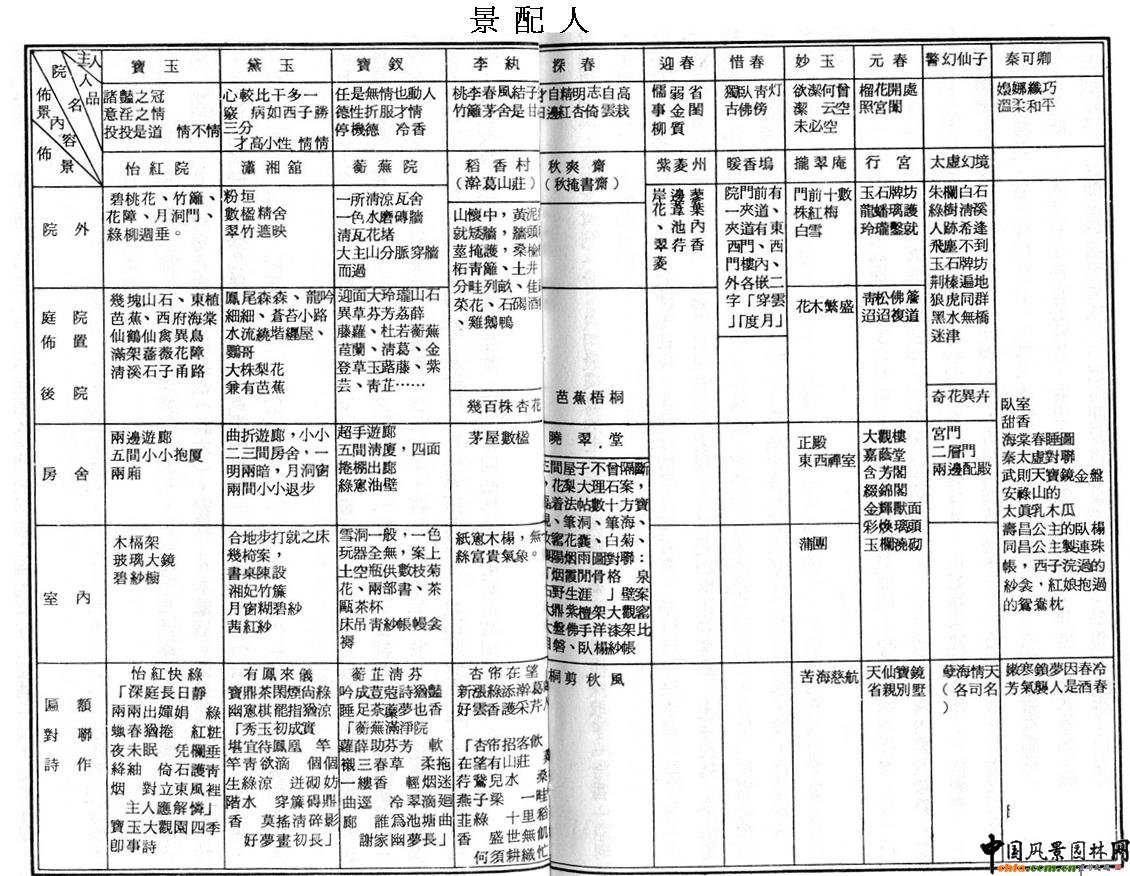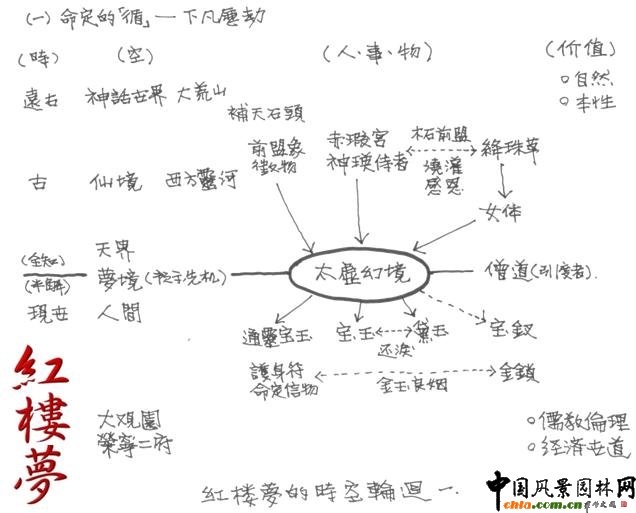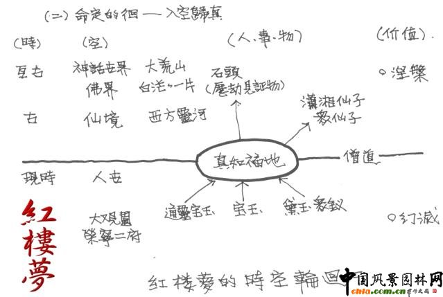 大觀園中各景區(qū)串連;“對景”應用較少,無“借景”、回廊的描述;水面主次不分;有假山;動植物;建筑品味;題對額。 ![]() 景配人(圖) 園林意念:“人間”、“仙境” 、“妖境” 、“仙鄉(xiāng)何處” 、“幻境” (佛道民間信仰+文人理想)。 b.由大觀園于小說之地位,論其象征意義 家族末世:起造→抄檢 創(chuàng)作說法: 有本說: ![]() 頤和園平面圖 ![]() 圓明園平面圖 ![]() 南京行宮圖 ![]() 紅樓夢的時空輪回--下凡歷劫 ![]() 紅樓夢的時空輪回--入空歸真 結(jié)論: 李澤厚:紅樓夢是中國封建末世文藝方面,一個出自士大夫的精彩大總結(jié)。 紅樓夢、大觀園此文筆園林的創(chuàng)作,是中國文化象征系統(tǒng)的翻新設計。 (中國文化里人生哲理儒、道、釋與小說里“真實人生”的驗證與思辯。)