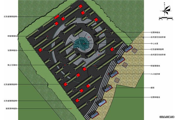 在此基底上,高起條狀種植臺,平行分布,如同田園,種植當地盛產的甘蔗。種植臺沿邊為座凳,供人在蔗園中休憩。
