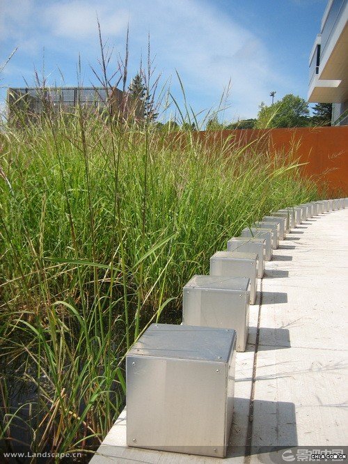 新Swenson科學(xué)樓的場地規(guī)劃引用了“科學(xué)陳列”(Science on Display)的概念。金屬的鋼結(jié)構(gòu)被鄉(xiāng)土植物環(huán)繞——顯示了明尼蘇達(dá)州北部特有資源的特色。庭院別具特色地設(shè)計(jì)了一個試驗(yàn)性的濕地花園,并以野生稻的種植作為主要景觀。由于花園本身對明尼蘇達(dá)州北部的美國本土居民的代表意義與重要性,它實(shí)際上已經(jīng)成為德盧斯大學(xué)師生的一個戶外實(shí)驗(yàn)室。
