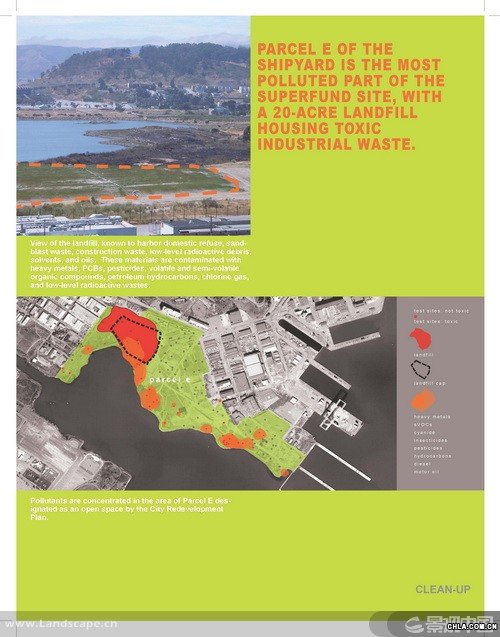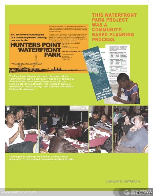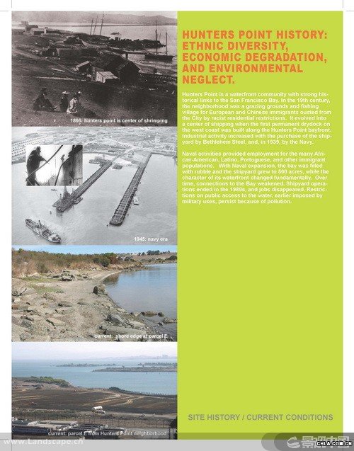 獵人角(Hunters Point)是一個(gè)坐落于舊金山的前軍事基地,現(xiàn)在瀕臨被改建為城市工業(yè)區(qū)的邊緣。受雇于非盈利性的環(huán)境正義組織的景觀設(shè)計(jì)師分析了位于獵人角船廠的公園發(fā)展計(jì)劃并制定了規(guī)劃理念。調(diào)解了社會(huì)對(duì)工地污染與人居中心潛力的沖突問(wèn)題,該項(xiàng)目證明了一個(gè)規(guī)模龐大的公園可以成為一個(gè)城市的經(jīng)濟(jì)發(fā)動(dòng)機(jī),凈化空氣的催化劑,和實(shí)現(xiàn)環(huán)境正義的關(guān)鍵一步。