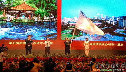 重慶市人民政府副市長凌月明(左三)從濟南市委副書記、市長張建國(左一)和住房和城鄉建設部副部長仇保興(左二)手中接過園博會主辦大旗