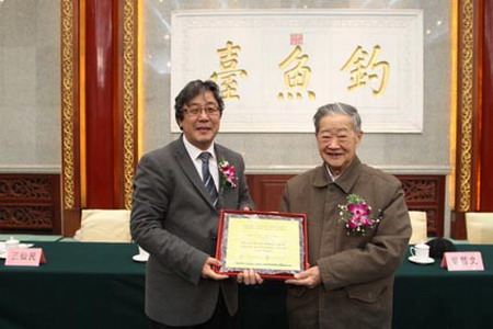 上海世博園總規(guī)劃師吳志強(qiáng)教授(左)榮獲2010世界生態(tài)建設(shè)杰出人物金獎,由著名古建專家、世界屋頂綠化協(xié)會名譽主席羅哲文教授(右)為其頒獎。