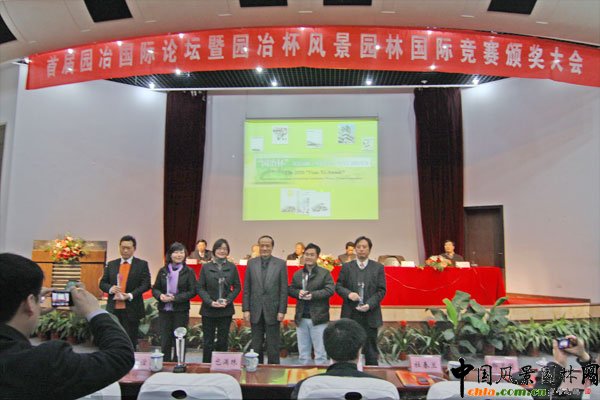 中國風景園林網 首屆園冶論壇暨園冶杯風景園林(畢業設計作品、論文)國際競賽頒獎大會于12月26日在南京林業大學隆重召開。近30所風景園林相關專業院校的近500名師生和業內專家、學者參加了此次盛會。南京林業大學副書記、副校長萬福緒致歡迎辭,住房和城鄉建設部總經濟師李秉仁、江蘇省建設廳副廳長王翔等領導出席并講話。大會為獲獎學生、教師代表和院校頒發了證書和獎品。蘇州科技學院建筑城市規劃學院在此次競賽中成績突出,獲得2個一等獎、2個二等獎、3個三等獎、2個鼓勵獎,并獲得本次競賽的團體獎和組織獎。下圖為蘇州科技學院建筑與城市規劃學院的代表老師與其他團體獎獲獎院校代表合影。