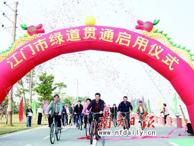 江門市綠道貫通儀式于去年12月底在西江邊的濱江大道篁邊驛站隆重舉行,標志總長266公里的珠江三角洲省立綠道江門段全線貫通。據江門市住房和城鄉建局局長馬克烈介紹,2010年來,全市累計投入資金近3億元,建成區域(省立)綠道286.4公里,完成率達108%,超額完成省下達266公里的建設任務,建成驛站12個,連接起了40多個自然景區和名勝景點,形成了一串璀璨的明珠,建設進度和水平均居全省前列。綠道將濱江山水葵林、世界文化遺產碉樓與歷史文化古村落等景點串聯起來,體現了僑鄉特色韻味。