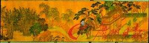 米萬鐘的《勺園圖》。米萬鐘是宋代大書畫家米芾后裔,為明代后期著名書法家、畫家,善山水,花,書法行、俱佳,與董其昌齊名。稱“南董北米”。他也因造園名噪,勺園是米萬鐘的三座宅邸園林其中之一,位于北京海淀之濱,充分利用了當時海淀一帶水源充沛、湖泊星連的有利地勢,園中景物全以水取勝,頗有江南水鄉之趣,并取“淀之水濫觴一勺”之意將之命名為“勺園”,曾是明末北京最著名的私家園林之一。畫家以獨特的視角,高超的技巧,將勺園百畝園景生動形象地一一展現在我們的眼前。