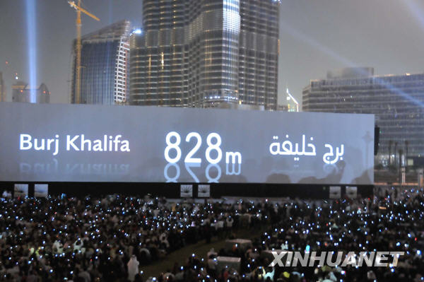 1月4日,在阿拉伯聯(lián)合酋長國迪拜舉行的“哈利法塔”(前稱“迪拜塔”)落成典禮上,大屏幕上顯示出樓高828米字樣。阿聯(lián)酋當晚為高達828米的“迪拜塔”舉行盛大落成典禮,并以阿聯(lián)酋總統(tǒng)、阿布扎比酋長謝赫哈利法·本·扎耶德·阿勒納哈揚的名字將其命名為“哈利法塔”。新華社記者安江攝