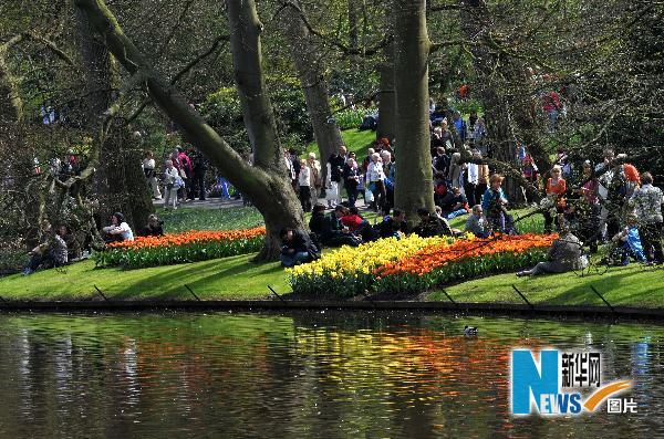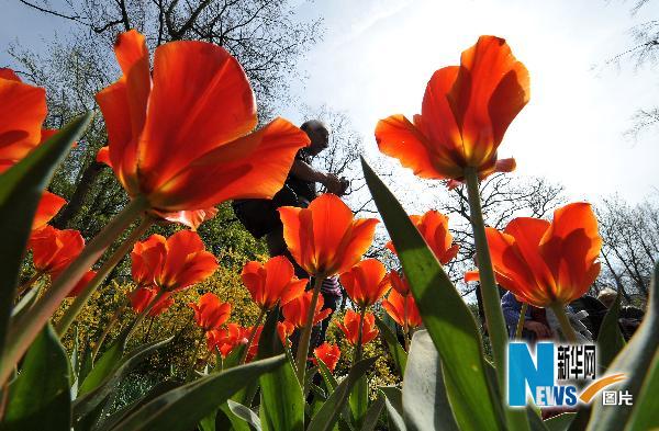 4月24日,游客在荷蘭中部城市利瑟附近的庫肯霍夫花園欣賞郁金香。庫肯霍夫花園是世界上最大的郁金香花園,種植有100多個品種的450萬株郁金香。隨著天氣逐漸變暖,郁金香和園內其他花卉競相開放,吸引了數以萬計的游客前來賞花踏春。新華社記者武巍攝