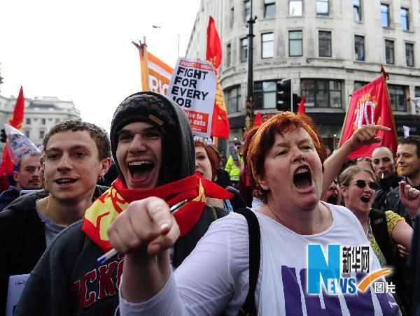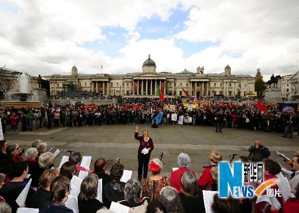 5月1日,人們在倫敦市中心特拉法加廣場參加“五一”國際勞動節(jié)集會。當日,數(shù)千人參加了倫敦多個勞工組織和社會團體舉行的游行集會,紀念“五一”國際勞動節(jié),呼吁勞工團結和社會公正。