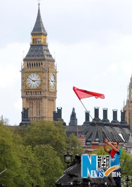 5月1日,一名男子在倫敦市中心特拉法加廣場的“五一”國際勞動節(jié)集會上揮舞旗幟。當日,數(shù)千人參加了倫敦多個勞工組織和社會團體舉行的游行集會,紀念“五一”國際勞動節(jié),呼吁勞工團結和社會公正。