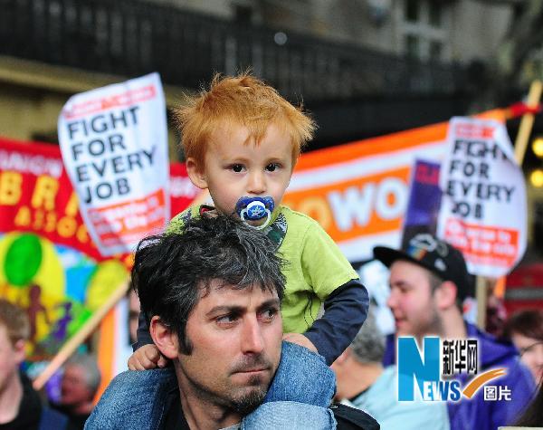5月1日,在英國首都倫敦,一名兒童騎在父親肩上參加“五一”國際勞動節(jié)游行。當日,數(shù)千人參加了倫敦多個勞工組織和社會團體舉行的游行集會,紀念“五一”國際勞動節(jié),呼吁勞工團結和社會公正。