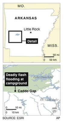 美國(guó)阿肯色州一個(gè)著名旅游度假區(qū)11日清晨遭遇猛烈洪水襲擊,至少有16名游客因被洪水卷走而喪生,還有40多人下落不明。事發(fā)前夜,當(dāng)?shù)剡B降傾盆暴雨,結(jié)果造成河水以每小時(shí)2米多的速度猛漲,沿河兩側(cè)的多個(gè)野外宿營(yíng)地中的300多人因此在睡夢(mèng)中不幸遭遇了滅頂之災(zāi)。