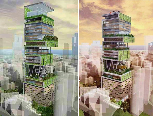 “Antilia”的設(shè)計(jì)錯(cuò)落有層次,大廈設(shè)有不同層次的花園綠色植物,這些綠化帶將大廈不同的功能劃分出來(lái),中部的一個(gè)大花園將會(huì)議設(shè)施和停車場(chǎng)與上部的住宅隔開(kāi)。