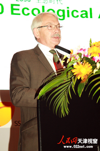 英國奧雅納(ARUP)全球公司主席Peter Head在首屆中國國際生態(tài)城市論壇上做主題演講分論壇“夢想與挑戰(zhàn) 生態(tài)城市建設(shè)的技術(shù)集成”上做主題演講。(攝影:楊秋煜)