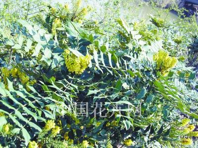冬陽十大功勞(圖五)小檗科十大功勞屬常綠灌木,系雜種十大功勞的園藝品種,株高2.5米至3米,冠幅2米,具密集鮮黃色成簇弓形總狀花序,立體型開花,花期從晚秋至晚冬。