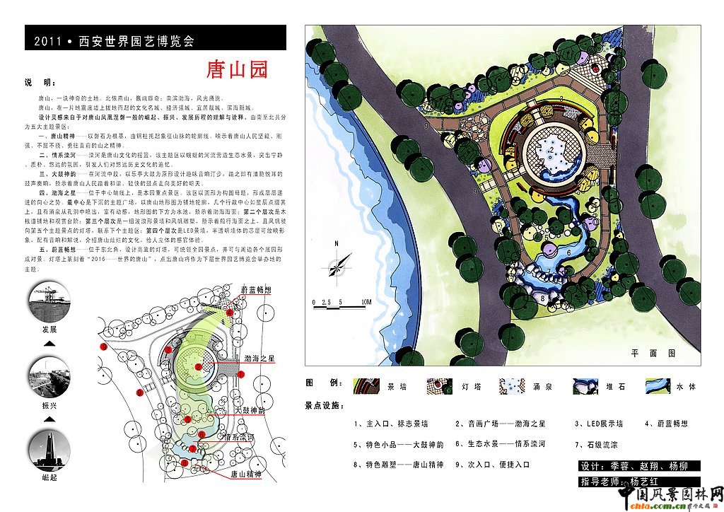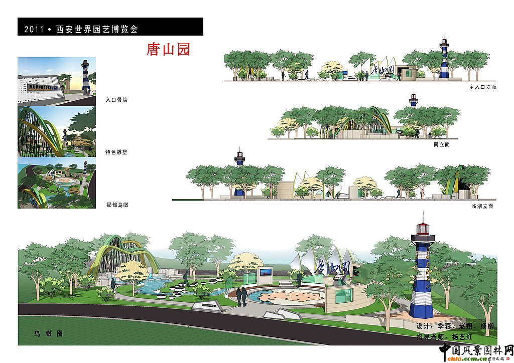 中國風景園林網訊 為配合2011西安世界園藝博覽會唐山展園的設計,提高南京林業大學風景園林專業大學生的規劃設計水平,鼓勵和激發大學生的創造性思維,引導大學生對風景園林學科和行業發展前沿性問題的思考,南京林業大學風景園林學院聯合河北省唐山園林局舉辦"2011西安世界園藝博覽會唐山園設計競賽"。以下為參賽作品集。 一等獎作品:城之涅槃--西安世園會唐山園設計 二等獎作品:振翅--西安世園會唐山園設計 三等獎作品:面向大海 面向未來 面向世界 第四名作品:承·啟--唐山“新唐園” 第五名作品:2011西安世界園藝博覽會唐山展園設計--鳳凰苑 第六名作品:西安世界園藝博覽會唐山園設計 其他參賽作品: 唐山園 說明: 唐山,一塊神奇的土地。北依燕山,巍峨雄奇,風光旖旎。 唐山,在一片地震廢墟上拔地而起的文化名城、經濟強城、宜居靚城、濱海新城。 設計靈感來自于對唐山鳳凰涅槃一般的崛起、振興、發展歷程的理解與詮釋。由南至北共分為五大主題景區:一、唐山精神;二、情系灤河;三、大鼓神韻;四、渤海之星;五、蔚藍暢想。 ![]() ![]()