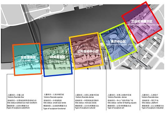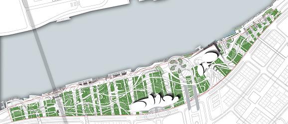 設計構思中,由防洪堤和交通網絡引發創作靈感,進一步聯想到山水自然線條的構圖形式,最終確立中國扇的上層植物結構形式配以流暢的地被網絡,形成一輪黃埔江邊亮麗的植物虹。橫向上強調布局的弧線分區與直線守邊相結合,豎向上通過對風向、遮蔭及視線等因素的綜合考慮,穿插形成整齊的南北向條狀林地。抬升的扇形基地比擬為折扇的扇面,按風向走勢而特意設置的喬木引風林比擬為扇骨,這樣整個灘的景觀構成了一幅生動而賦有韻味的中國水墨山水畫。(如圖2)