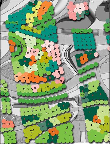 西端后灘基地保留著原生的濱江濕地,能在黃浦江邊創造一段生態濕地,展現自然的水陸交界景觀,有著特殊的示范意義。因此設計中選取了較為生態的灘的自然結構模式,局部設置生態濕地展示區,以保證與基地西端生態濕地的聯接,達到濱江景觀帶的整體延續性,形成一個自然循環的微生態環境。 特色林地景觀模擬自然界森林、花島等景觀,結合地形、水體、道路來組織植物景觀,體現植物自然的個體美及群體美。在具體組織中做到疏密有序,在大面積的林木種植中結合花灌木及地被的綜合設置,模擬自然界的植物形成態勢。 中部區域主要人流出入口地段、高架立交體系周圍以及與城市道路相鄰的開放綠地內,主要以植物結合地形起伏分隔空間,并利用大片草坪及地被植物。從空間上給人以寬敞舒適的視覺享受,同時也有利于世博會節日氣氛的營造。在人流聚集較多的場所,如慶典廣場等大型集散場地周圍解決處理好場地透水技術的同時,將部分草地種植為耐踐踏草坪保證人流在高密度時可在草坪上休憩等候。 工業文明展示區中將部分用于碼頭貨物運輸的工業吊塔進行功能轉換,形成多層次的空中立體綠化展示。 在公共演藝中心與空中立體花園之間,以硬地樹陣的方式保證游人的停留與休憩。在改造時保留原工業時代的烙印,使用先進的垂直綠化科技,進行綠化城市的展示。 2.3系統色彩的退暈 上海世博公園綠地植物設計以綠色深淺不一的常綠樹、落葉樹、針葉樹、闊葉樹配以按冷暖色調組合出美麗色彩圖案的地被植物,呈現出賦有漸變退暈效果的韻律景觀。 植物美最主要表現在植物的葉色,絕大多數植物葉的葉片是綠色的,但植物葉片的綠色在色度上有深淺不同,在色調上也有明暗、偏色之異。這種色度和色調同時又隨著一年四季變化而不同。如垂柳的初發葉時由黃綠逐漸變為淡綠,夏秋季為濃綠。春季銀杏葉子為綠色,到了秋季則變為黃色。五角楓葉子在春天先紅后綠,到秋季又變成紅色。公園上層喬木林正是運用葉色的變化組合成多變而有趣味的園林景觀。(如圖4) 公園綠地下層地被利用植物色相的差異,形成由西區冷色逐漸過渡到東區暖色的序列景觀,創造出和諧、溫和的氣氛,加之以明度、彩度的差別運用,達到豐富多彩的調和狀態,形成既有統一又有退暈效果的漸變景觀。(如圖5)