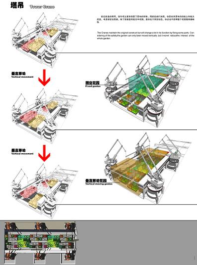 在上海世博公園綠地規劃設計中本著"體現科技世博"的宗旨,充分合理應用先進的科學技術,創造了各種現代化的植物群落景觀。 位于工業文明展示區的空中立體花園巧妙地運用了機械原理,將四個塔吊組成一組,使它們之間相互聯系,輔助設置水平垂直交叉的觀光交通體系,運用軌道的水平運動及吊塔的垂直運動,組合出立體的運動方式,產生許多趣味性極強的體系,在運動的平面中種植些色彩艷麗的地被類植物,在垂直面也引進先進材料進行城市立體綠化展示,成為上海甚至世界獨一無二的空中花園,給人一個休息娛樂空間,一個懷舊歷史、展望未來理想去處,同時成為了上海又一個獨特的彩色風景。(如圖7)