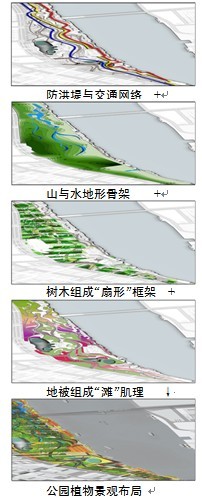 圖 1 設計理念分析 1、植物景觀系統規劃布局特點 植物景觀系統規劃主體結構形式銜接城市外部環境 城市道路網絡形成城市肌理骨架,將上海世博會公園周圍的城市地域分成條狀地塊指向黃浦江,喬木是構成大尺度綠地植物景觀以及同樣面積中獲得綠化葉面積指數最大的植物材料,因此,在植物景觀整體結構骨架設計中,通過對風向、遮蔭及視線等因素的綜合考慮,以"扇骨形狀"布置喬木林,形成與江面基本垂直、喬木群落邊界完整、樹陣形式為主南北條狀林帶的骨架肌理體系。扇骨結構尺度呼應大尺度的城市空間,整齊的扇骨喬木種植體系與城市和園區規劃肌理協調,將世博園區與黃埔江緊密銜接,有機地達到江與城的交融。行列種植方式和科學植物配置,有利于江面視線穿透和空氣的對流及凈化,并創造出特色鮮明的濱江景觀及序列性的植物景觀。