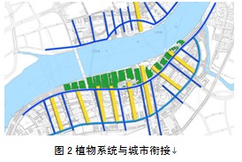 圖2 植物系統與城市銜接 植物景觀系統規劃配置模式漸變協調公園分區景觀 上海世博會公園植物景觀系統規劃圍繞著人流活動及場所特征的變化而設置出與公園綠地分區功能結構相吻合的植物景觀區域,分別為:空中立體花園景觀區、屋頂花園景觀區、人工林地景觀區、林帶地被景觀展示區、濕地景觀展示區、生態濕地植物景觀區。整個植物景觀系統規劃根據其所在地域地形的起伏、水體的穿越、人流的聚集等不同的因素,進行該群落的主題設計,由東向西通過人工配置模式逐漸向自然配置模式漸變,形成了對比統一的喬木林帶種植形式,組成形態規整、變化多樣、完美統一的系統,將公園綠地分區與植物景觀區域協調一致,延續了植物景觀系統規劃體系"從人工到自然"的過渡。配置模式以喬木林帶邊緣完整性配置模式來"延續整體骨架",以喬木林帶內部空間植物群落自然配置模式來體現自然景觀。