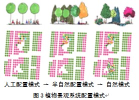 圖3 植物景觀系統配置模式 植物景觀系統規劃色彩冷暖序列體現世博會展氛圍 上海世博公園植物景觀系統規劃以"灘的形成"來創造變化豐富的自然植物群落,用灘的蔓延形成種植色彩的褪暈漸變,來展示世博會館展與觀賞演出的喜慶氛圍,以及體會自然生態景觀與回味工業歷史的靜思氛圍。利用公園綠地下層地被植物色彩的差異,在世博中心軸為中心區的區域選用較為強烈的暖色色彩植物進行種植,兩邊的基地區域種植冷色色彩植物,由中心區向基地兩端過渡的綠地區域,種植的植物色彩強度與色相逐漸減弱,形成由中部暖色分別逐漸過渡到西區、東區冷色的序列景觀,創造出熱烈、和諧、溫和的氣氛,形成協調漸變的植物褪暈景觀體系。選擇運用不同葉色和花色的地被植物,以及不同明度、彩度的差別構成自然式種植群落結構,達到豐富多彩的調和圖案,其組成形態看似無序但又被無形的體系完美地統一在植物景觀系統中。