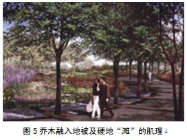 圖4 植物景觀系統色彩的褪暈漸變 2、植物景觀的群落配置 植物景觀的主體空間構成 用"重地被,弱中層,強上木"的立體空間構成模式,構建出植物景觀設計的主體空間體系,解決了世博會議期間高容量、高密度人群對大量集散場地和大量的遮蔭需求,以及人們對開闊空間、通暢視野、喜悅氛圍環境的要求。植物景觀通過注重下層花灌木及地被植物的合理配置,削減中層灌木體量,強化上層混交喬木林態勢的配置模式,也形成了獨特的上海世博公園綠地植物群落景觀的空間藝術形式。它利用簡潔明快的喬木列陣和樹種多變的喬木種類,與曲折變化的地被色帶相銜接,結合地形的高低起伏和綠地植物所在設計區域的功能,形成一條條豐富而有韻律的林冠、林緣線,劃分出變換多樣的空間模式,起到美化和協調周邊環境作用,產生虛實結合的意境效果。在綠色草坪基調上渲染出豐富多彩的色塊,不僅視覺上自然活潑,創造出高低起伏、含蓄多樣的植物群落景觀,也擴大了公園的園林空間。